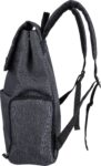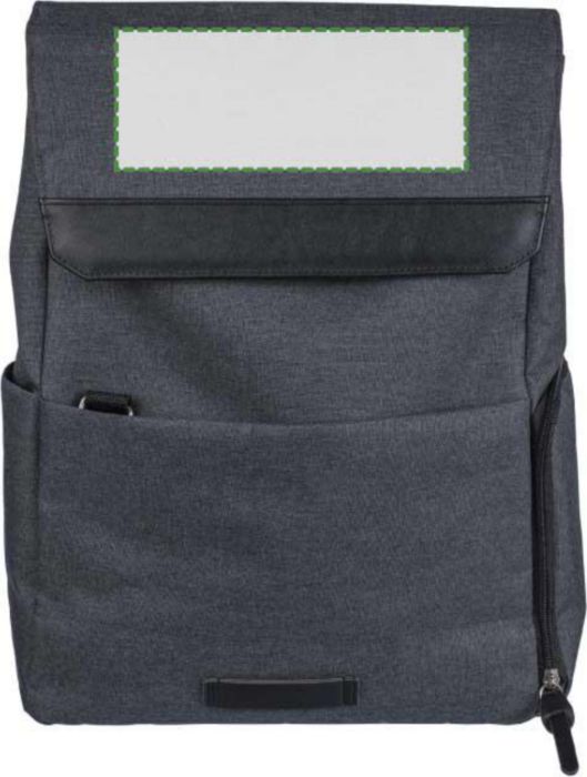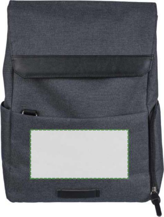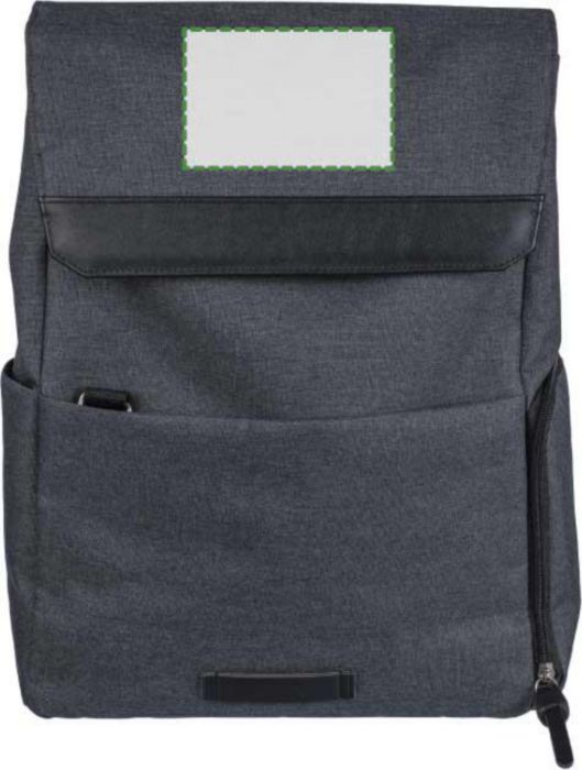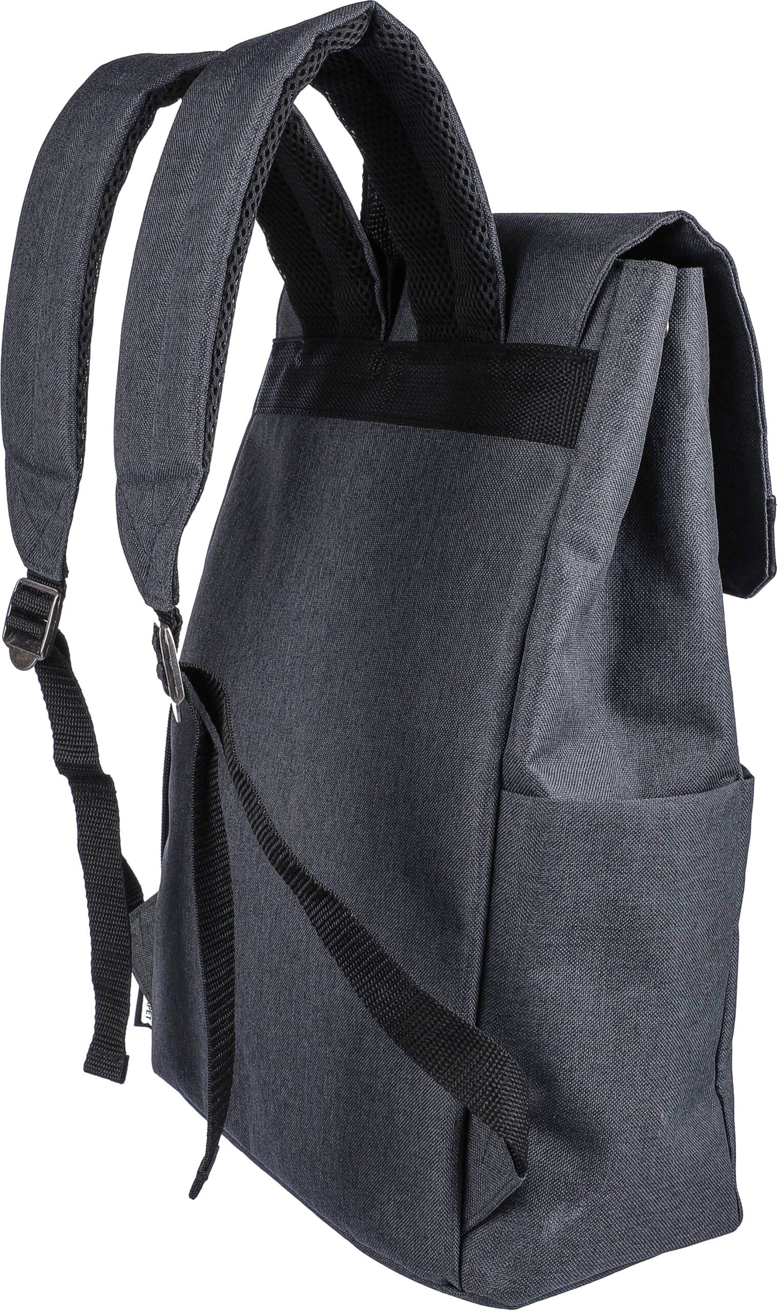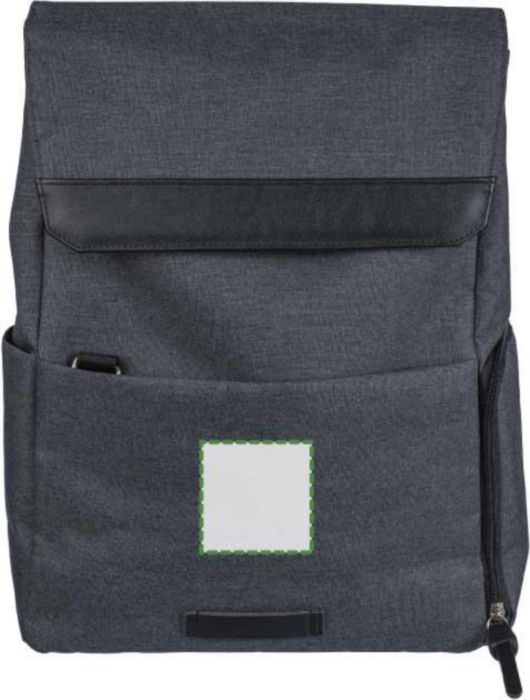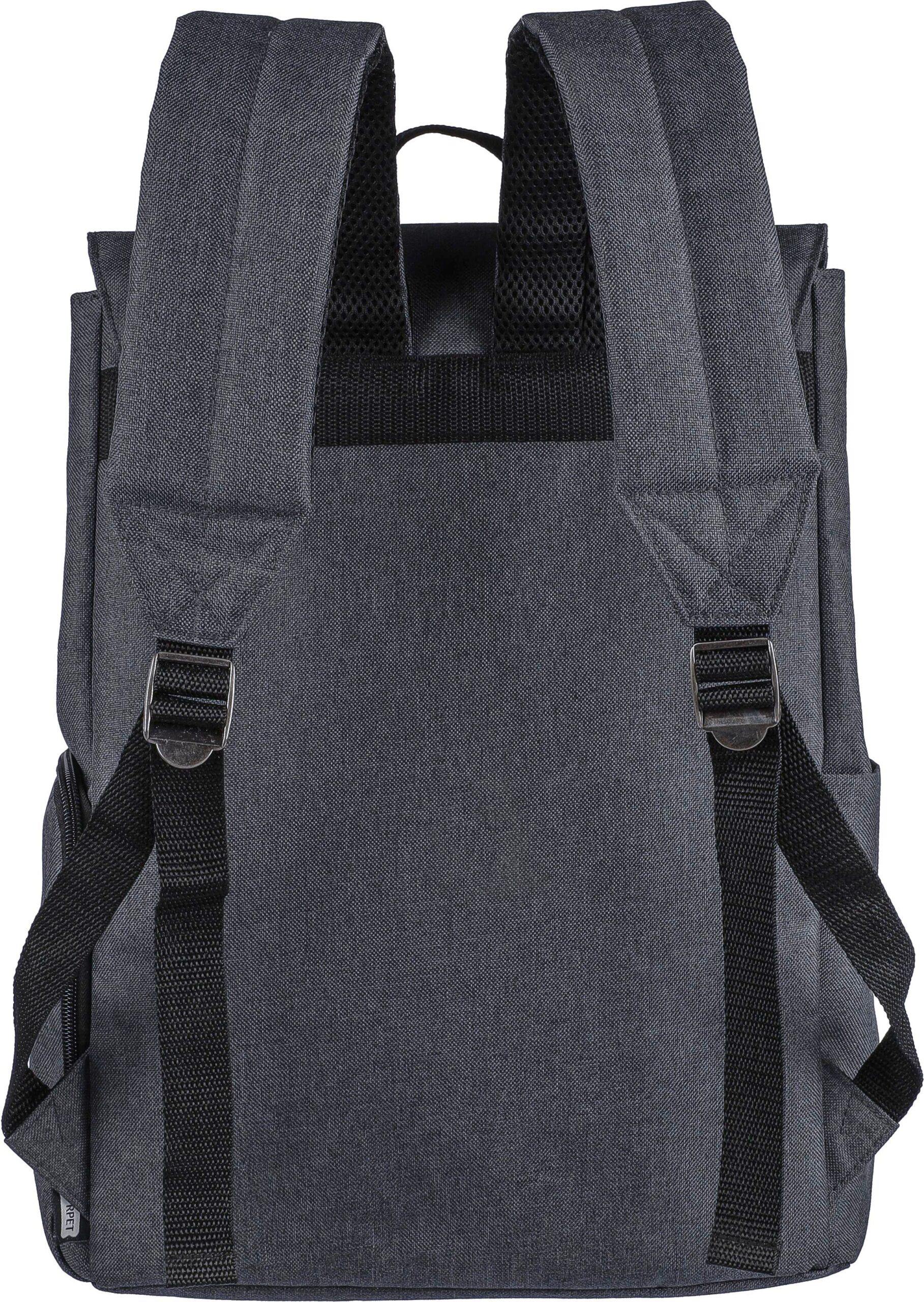 600D polyester canvas laptop backpack (15 inch) with PVC detail and 210D lining. Features a small zippered front pocket with a carabiner for keys, one zippered side compartment, one regular side pocket, and a large magnet-closed compartment with a laptop pocket. Push buttons on the side to close the backpack when not fully filled. Adjustable ventilated straps. Includes an rPET label on the front.