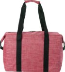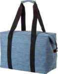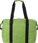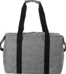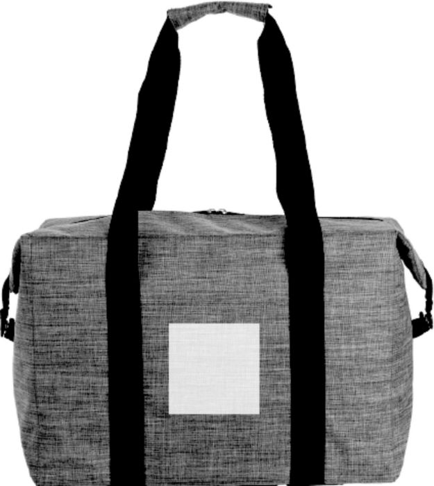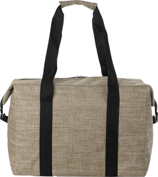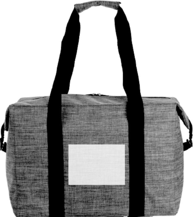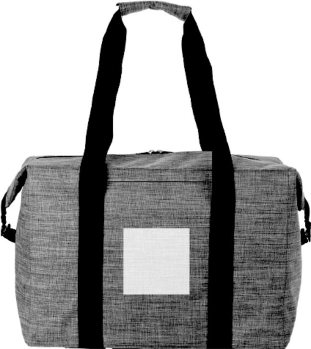600D polyester cooler bag. One large compartment and one small pocket on the front side. Two short carrying straps with Velcro closing. Inside is foam insulated with aluminum.