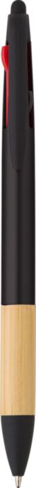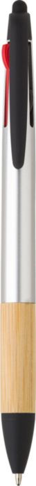 ABS 3 colour ink ballpen with bamboo grip and stylus tip. Ink colours: red, blue, black.