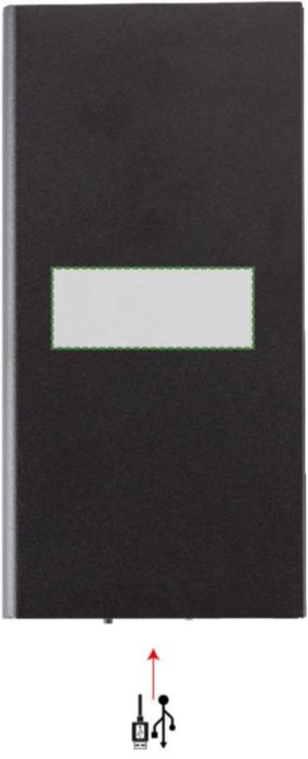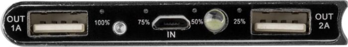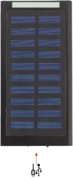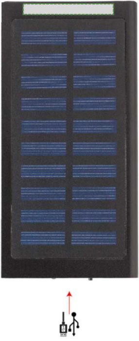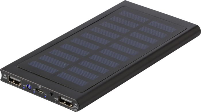 ABS and aluminium solar power bank, 8.000 mAh. Input DC5V/1A. Output data: DC5V / 1A and DC5V / 2.1A. Including cable (USB – micro USB).
