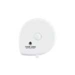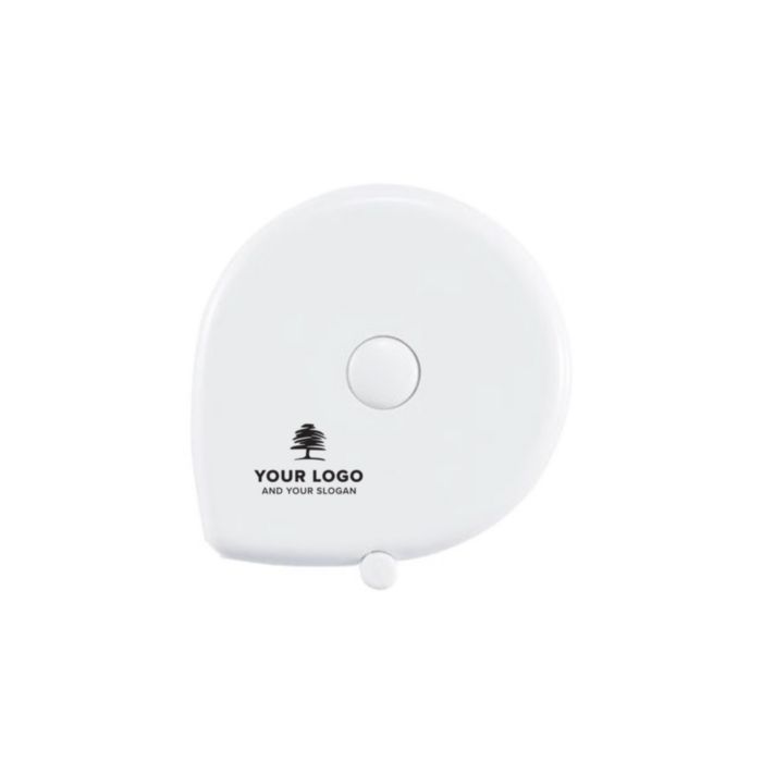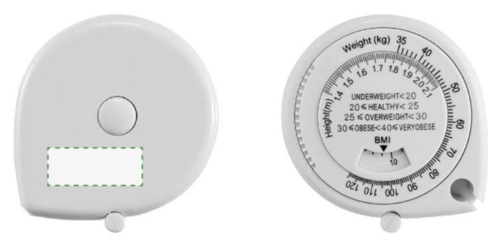 Plastic BMI tape measure (1,5 m), with a white stop button, includes a weight (kg) and height (m) indicator on the front. For promotional purposes.