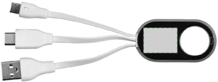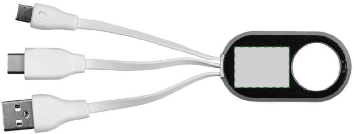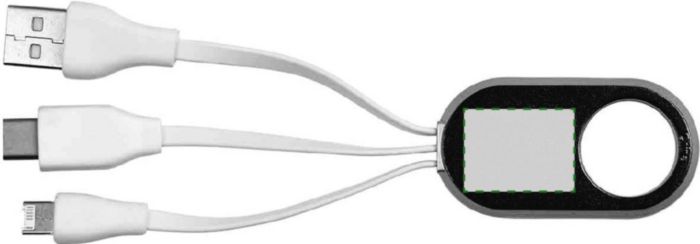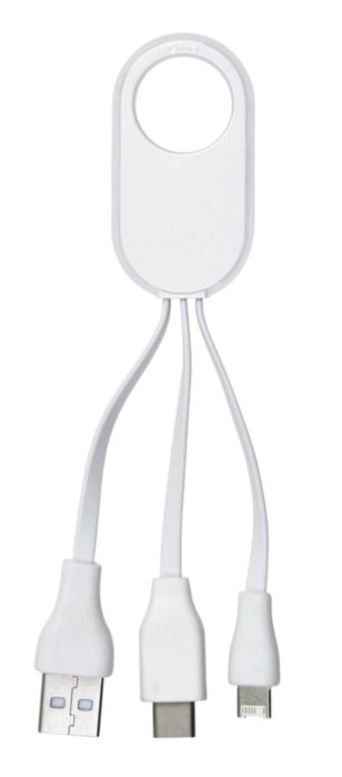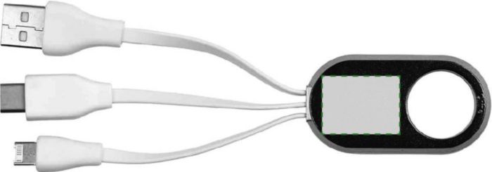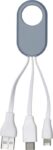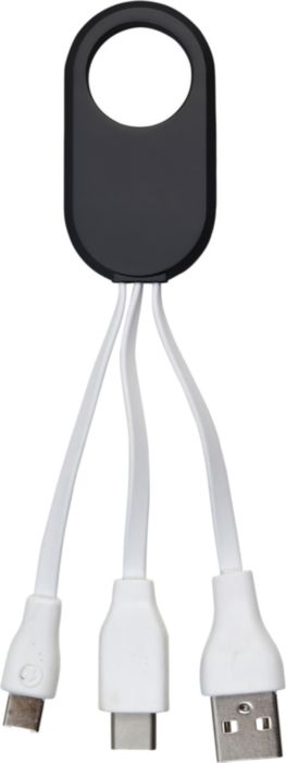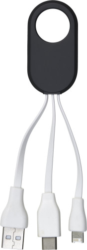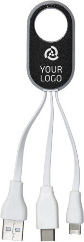 ABS 3-in-1 charging cable set with USB-C, Lightning, and standard USB. Each cable is approx. 5,5 cm long and attaches to a holder with opening (Ø 1,8 cm).