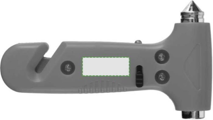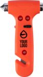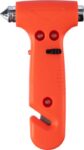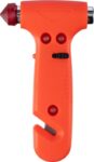 ABS emergency hammer, including white LED light (switch on/off), integrated seatbelt cutter, and window hammer. The hammer is protected with a rubber tip. Individually packaged in a brown carton box.