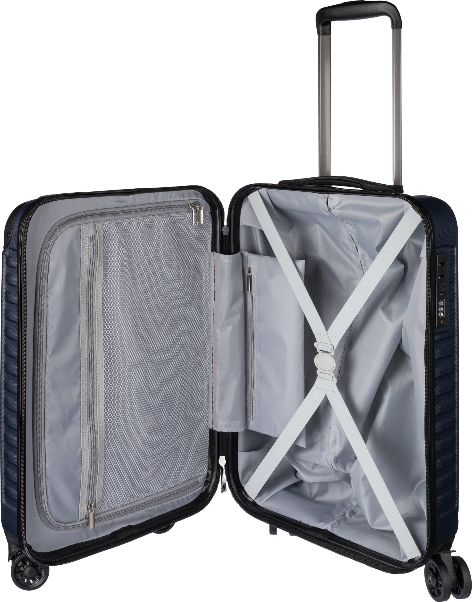 ABS luggage trolley (20 inch) with 8 wheels and a three-level handle system. Includes number lock and a separate plate for laser engraving.
