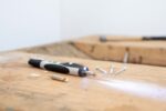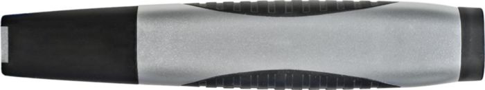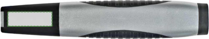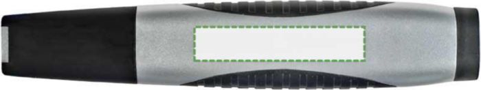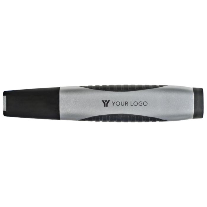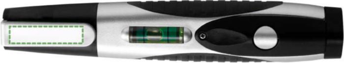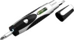 ABS mini plastic toolkit with four different screw bits, two cross-head and two flat-head, spirit level, and a blue LED light. Batteries included.