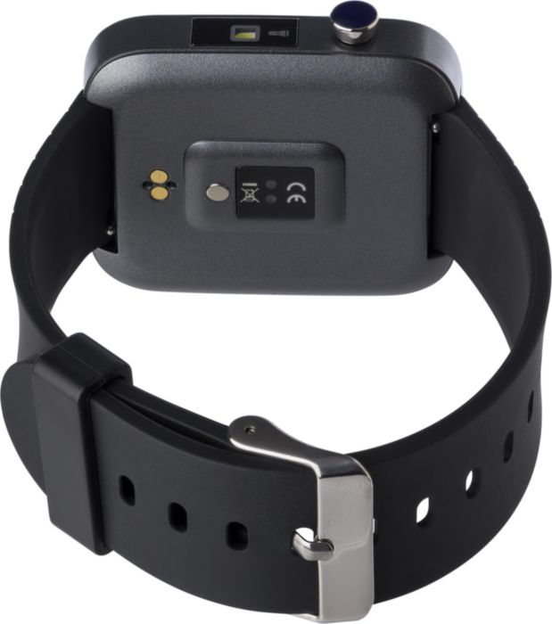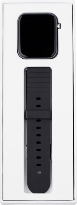 ABS and PC smart watch with TPU wristband and wireless technology. Watch has a 1,54” IPS display and is IP67 waterproof. Functions: time, steps, distance, calories, heartrate, bloodpressure, notifications, phone finder, and more. Including USB cable.