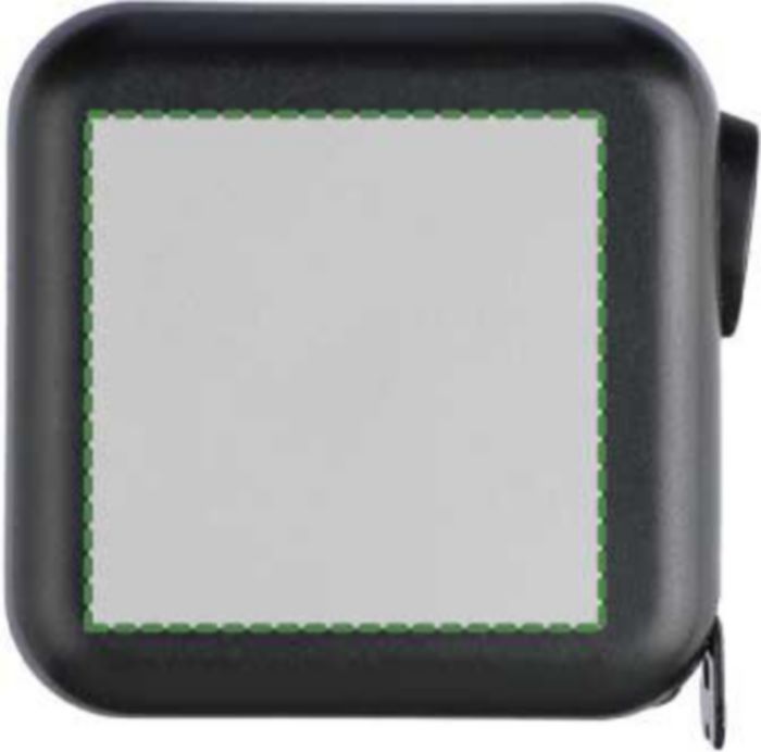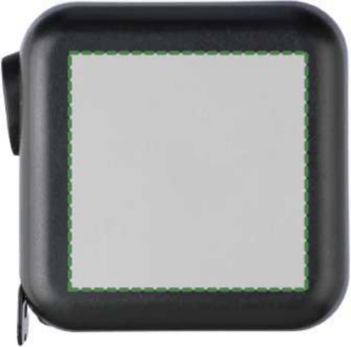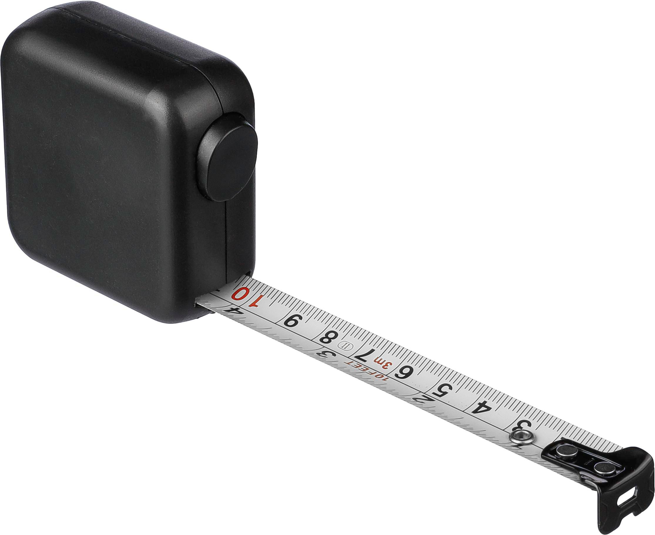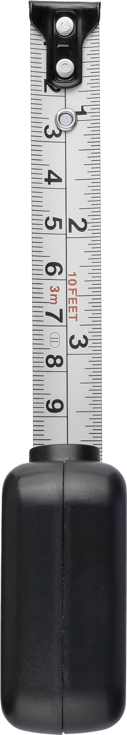 ABS tape measure. 3 meters in length. Tape made from metal (16 mm) printed with both centimeters and inches. Ultrasonically assembled (screwless). Includes push button with lock. Individually packaged in a brown cardboard box.