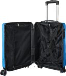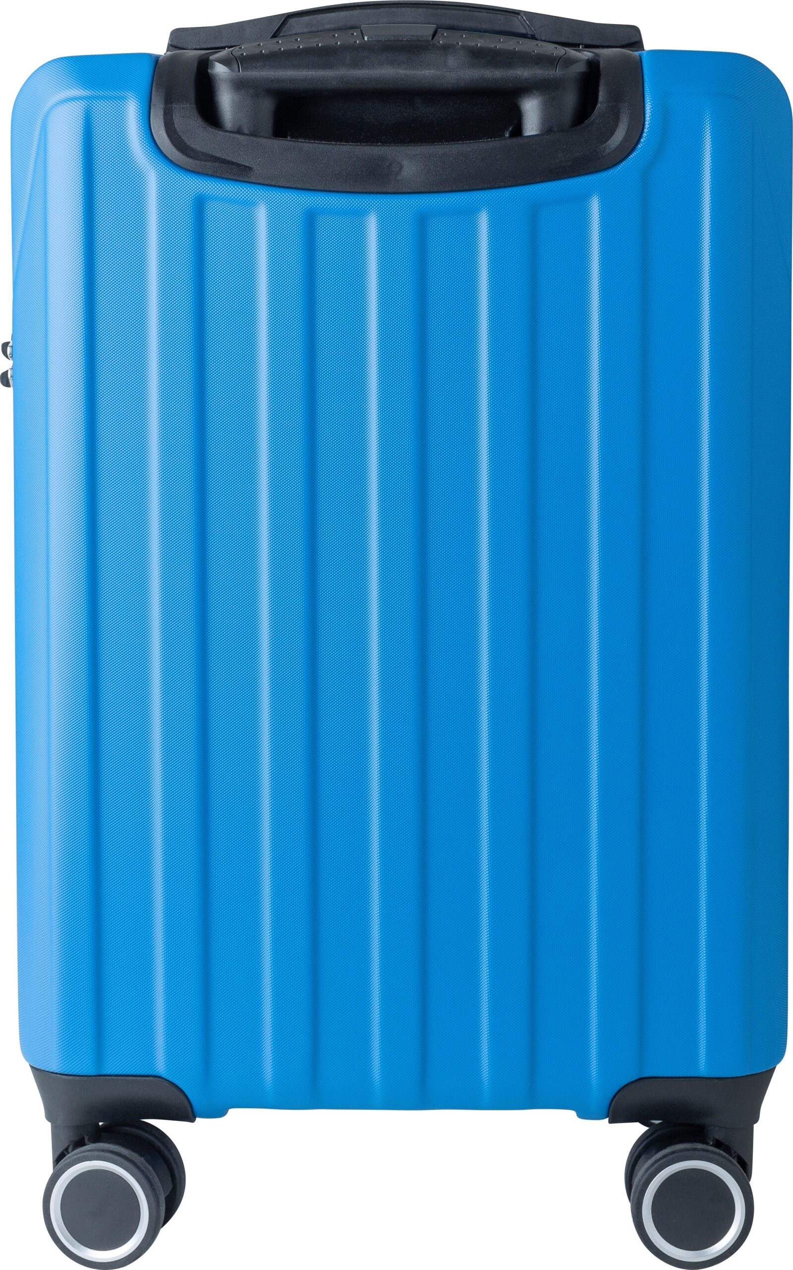 ABS trolley 20-inch with a hard-shell design, 8 caster wheels (4×2), and a three-level metal handle system. It includes a top plastic handle, a combination lock (non-TSA), and a laser engraving plate with 3M tape. The interior, lined with 210D material, has three compartments: a U-style zipper pocket, a mesh pocket, and X-style webbing with a buckle. Capacity: 30L. Individually packaged in a brown cardboard box.