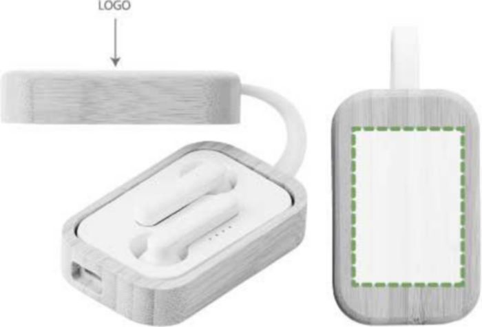 ABS earphones with a bamboo case. With wireless connection technology. Includes charging cable.
