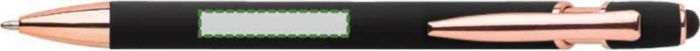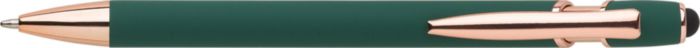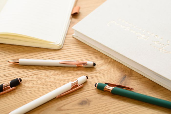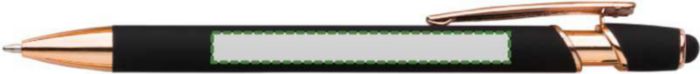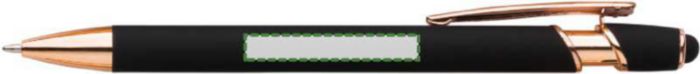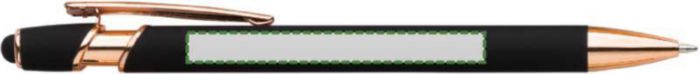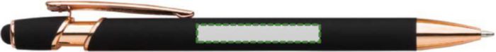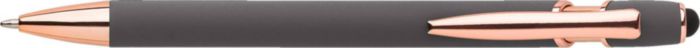 Aluminium ballpen with rose gold details and rubber tip for capacitive screens. Blue ink. When engraved the design will be silver colored.