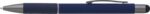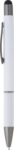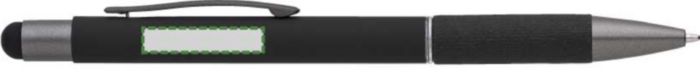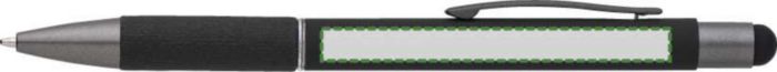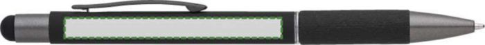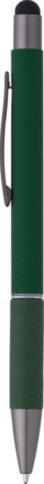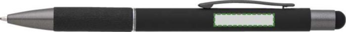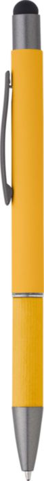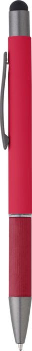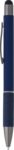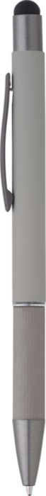 Aluminium ballpen with rolled paper details on the grip. Rubber tip for capactive screens. Blue ink.