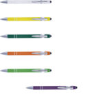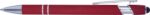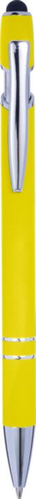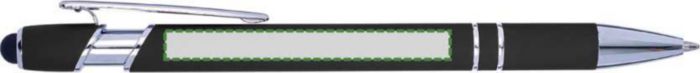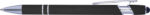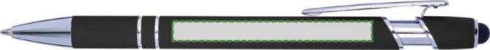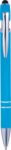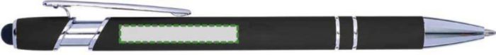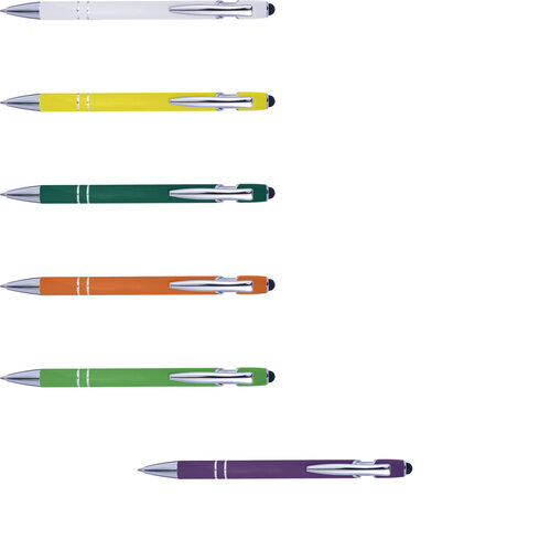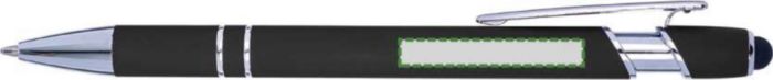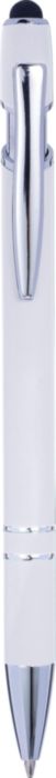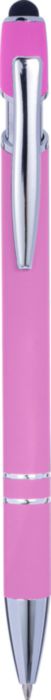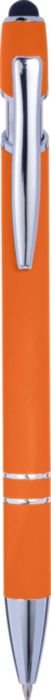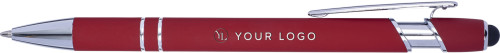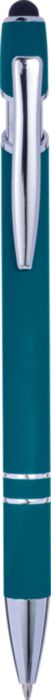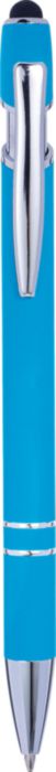 Aluminium ballpen with rubber coating and rubber tip for capacitive screens. The tip and clip are silver coloured plastic. Blue ink.