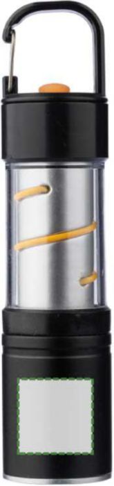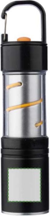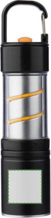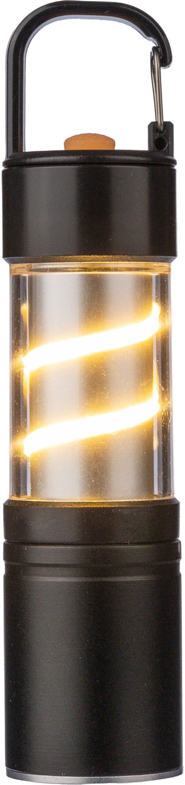 Aluminium and alloy COB flashlight with ABS casing and metal clip on the back. Features 3 light functions, zoom mode, and a black carabiner on the top side. Powered by a 14,500–500 mAh Li-ion battery with Type-C charging. Delivers 130 lumens and includes a 30 cm black cable. Push button operation and magnetic base. Individually packaged in a brown cardboard box.