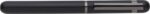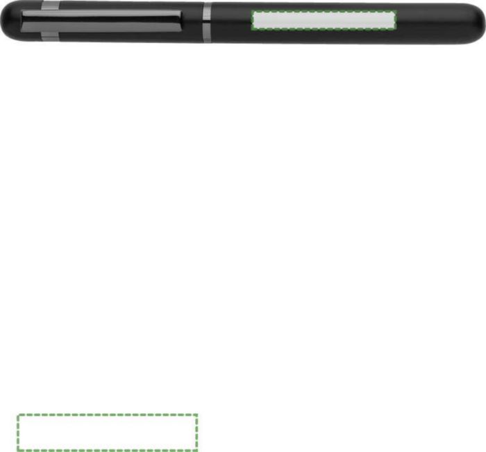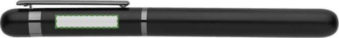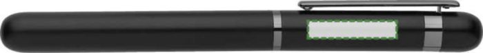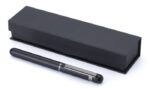 Aluminium and brass rollerball pen. With shiny details on the clip, ring, and push button. Blue ink. Individually packaged in magnetic giftbox with paper sleeve.
