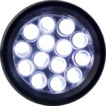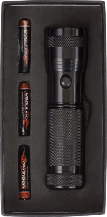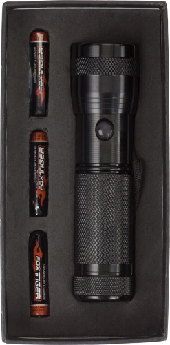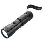 Aluminium pocket torch with 14 LED lights and wrist strap. Packaged in a black gift box. Batteries included.