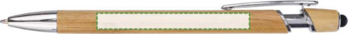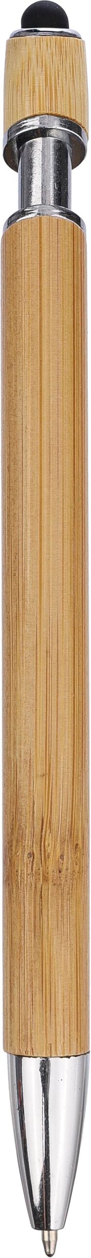 Bamboo ballpoint pen with chrome metal details. Tip in chrome plastic and a metal clip. Colored stylus on the push button. Approx. 800 meters of writing length. Blue ink.