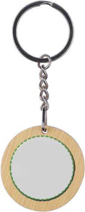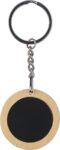 Bamboo keychain with a black rubber-coated stainless steel engraving plate inside, in a round shape. The color after engraving is shiny chrome. Individually packaged in a brown carton envelope.