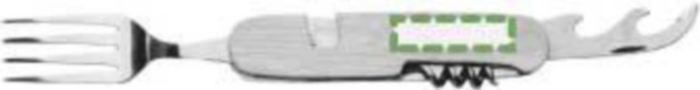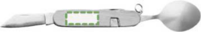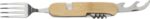 Bamboo multifunctional cutlery set (spoon, fork, knife, bottle opener, smaller knife). Cutlery can be separeated for both hands. Individually packaged in a brown cardboard box.