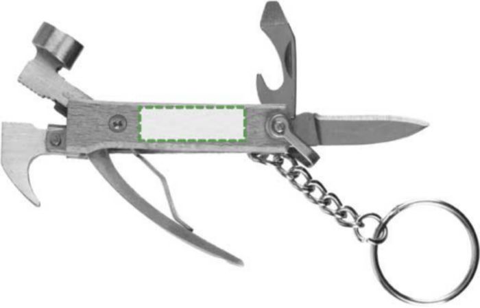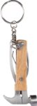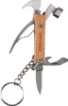 Bamboo multitool with 7 functions, including a keyring. Individually packaged in a brown carton box.