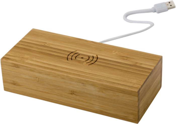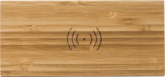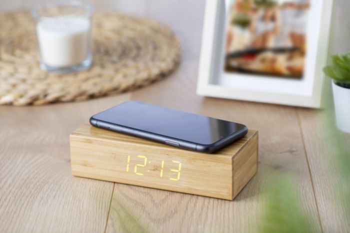 Bamboo wireless charger of 5W, with integrated LED clock display with white light. The charger has a micro USB port. Buttons on the bottom for setting the time. Including cable and batteries.