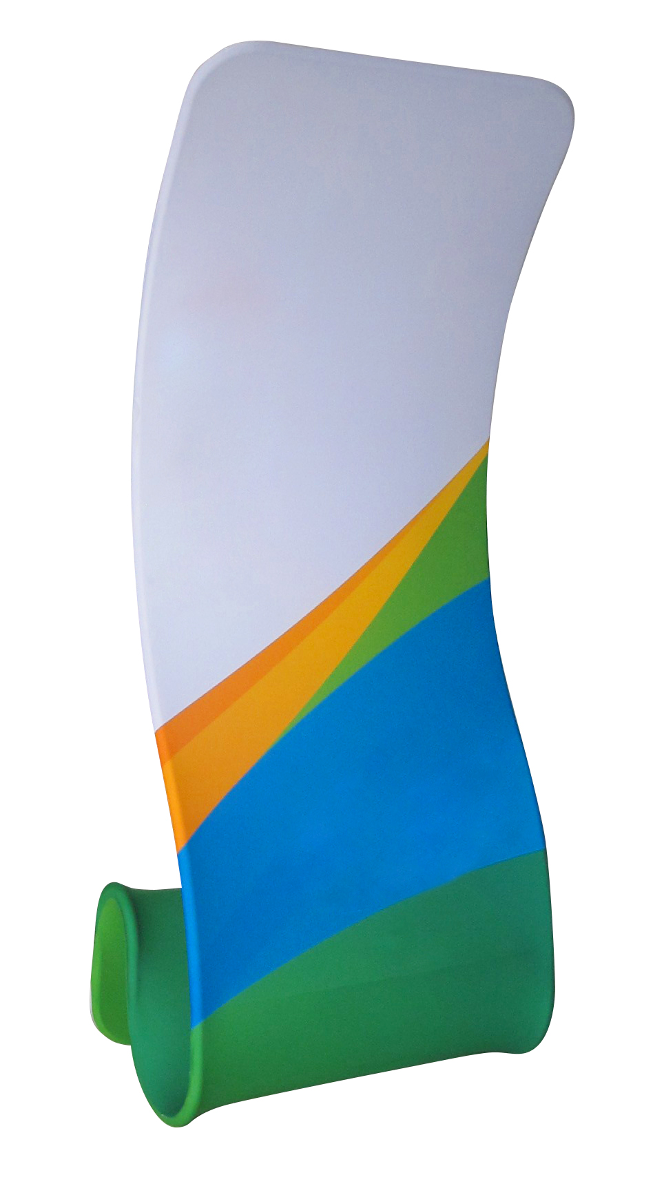 Curved banner stand. Size 91×228 cm. Fabric is pulled over the aluiminun tube frame and closed with a zipper. Weight only 4,5 lg. Packed in an oxford bag.