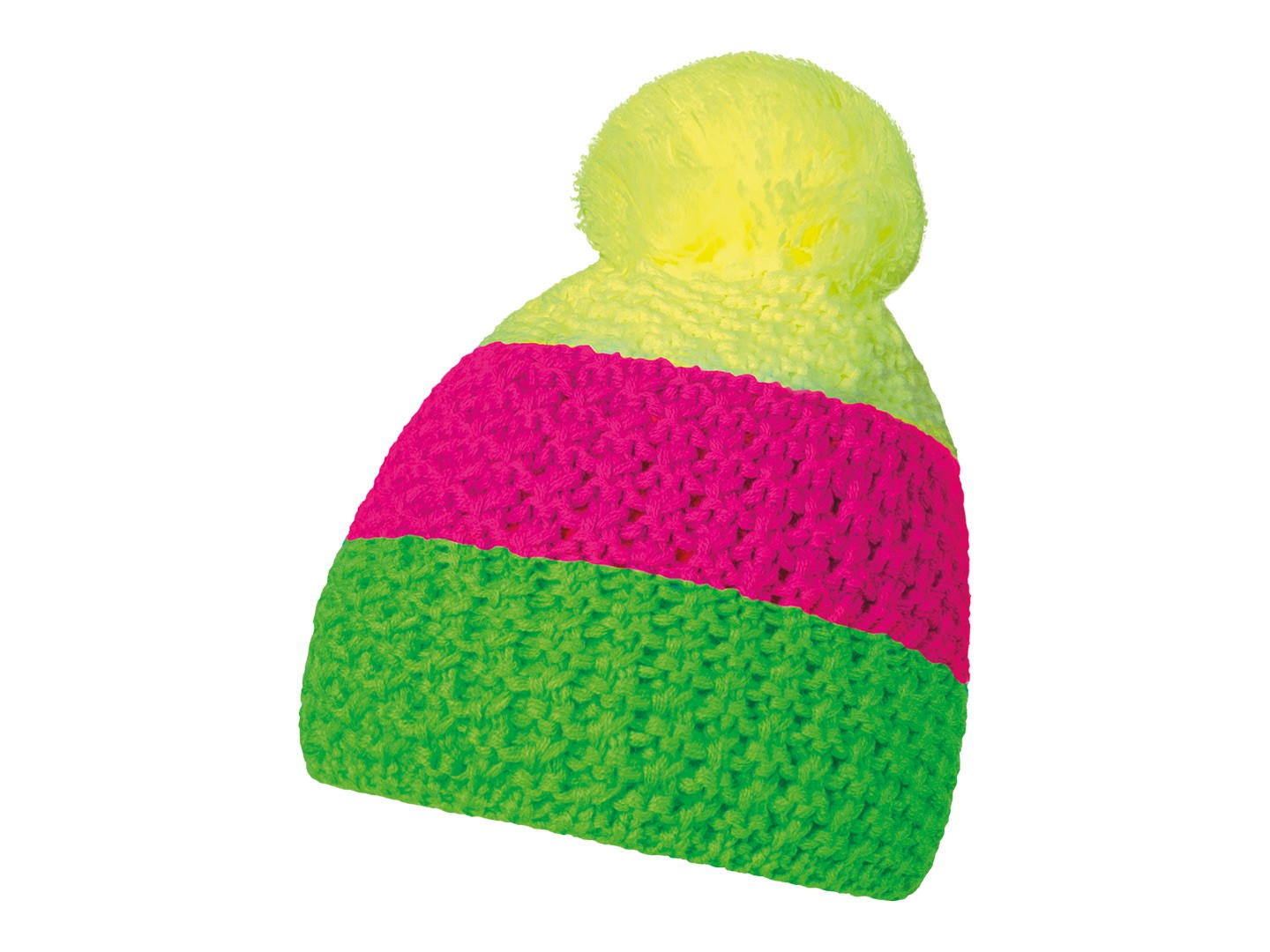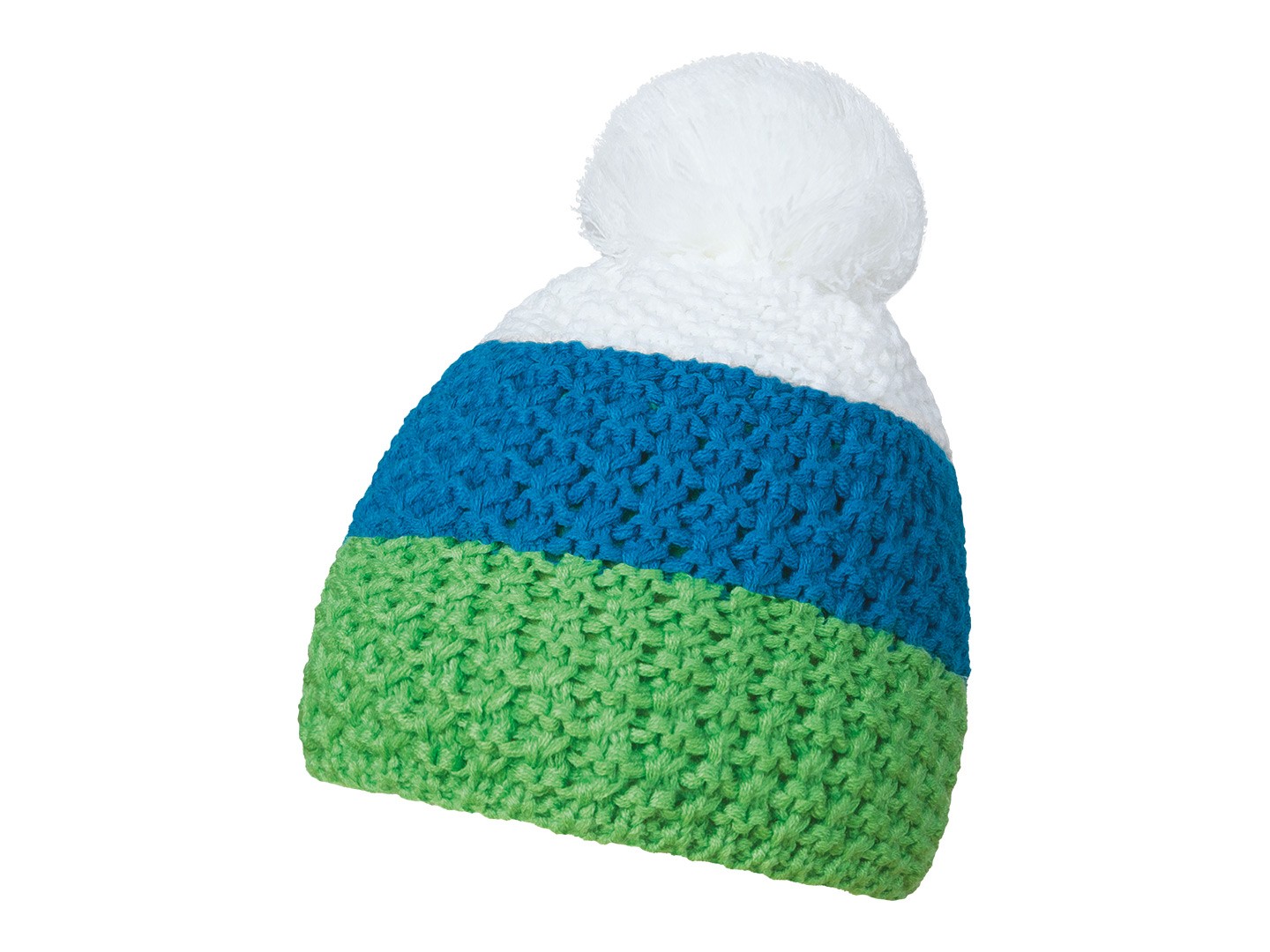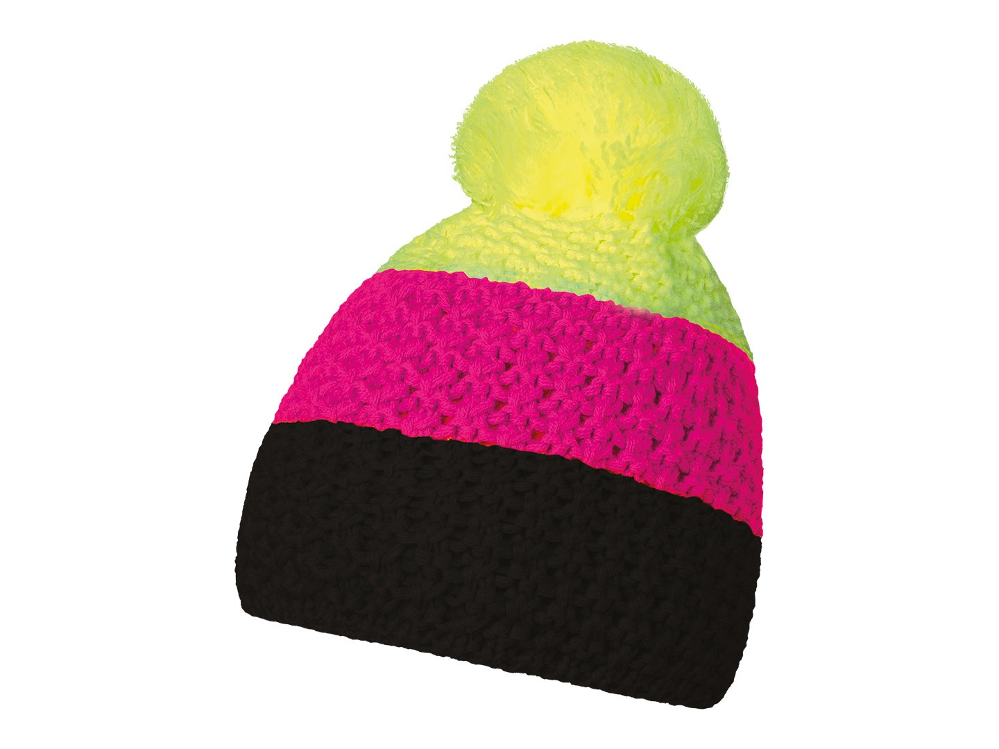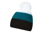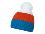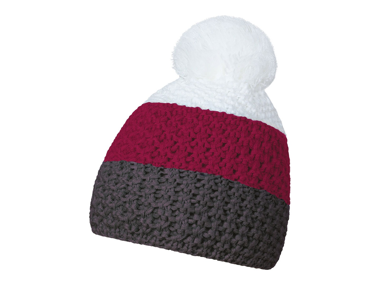 Nice adult universal beanie with pompom, seven different color variations available. The beanie is cheerful because of the color changing in three stripes. Cold days will be fun when wearing this model.
