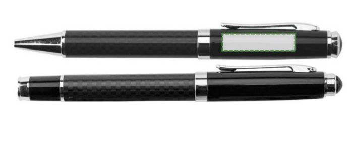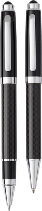 Metal pen set consisting of a metal ballpen and rollerball pen. Packaged in a luxury gift box with magnetic closing. Sold per 50 pieces. Black ink.