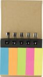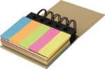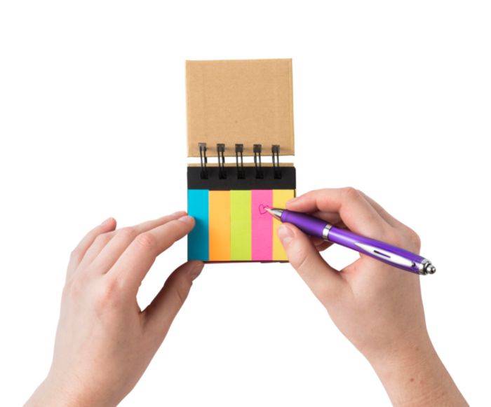 Cardboard, wire bound booklet with a total of 250 sticky notes in different colours and 2 different sizes.