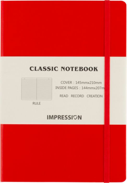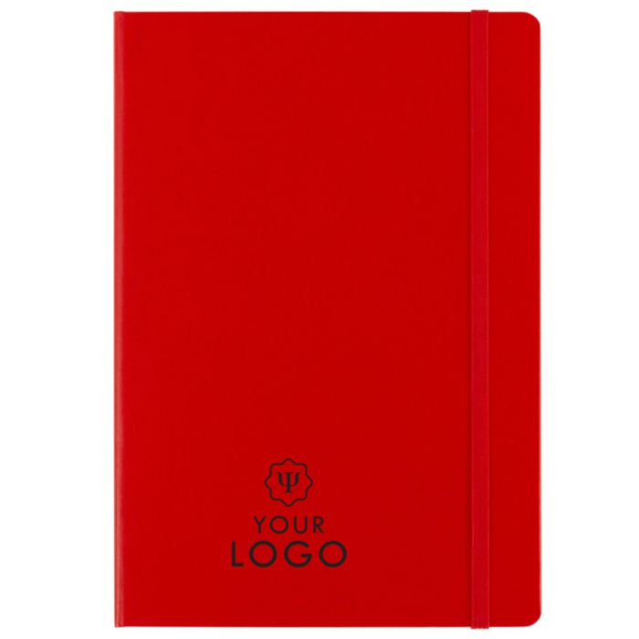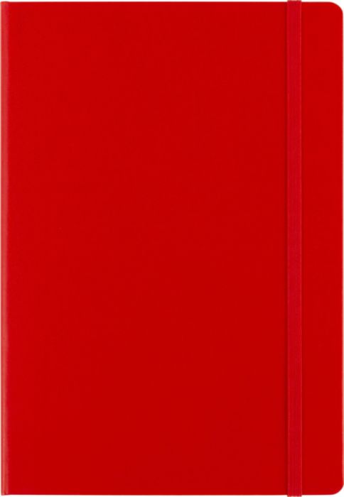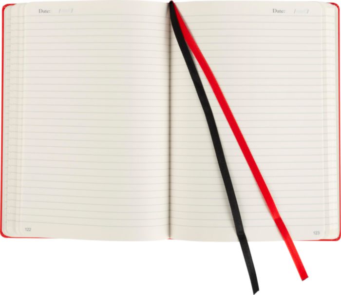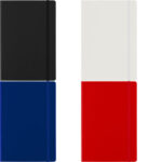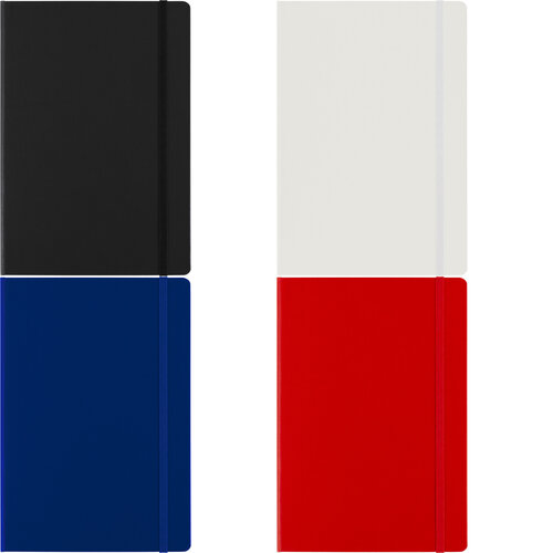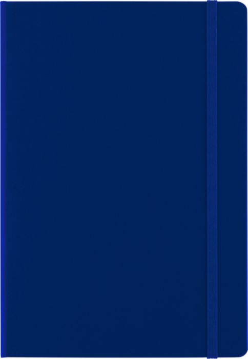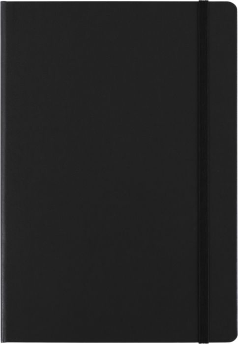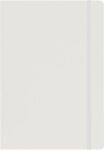 Luxurious cardboard notebook (approx. A5) with 128 lined pages, ribbon markers, elastic band over the cover and pocket on the inside of the cover. Including subtle Impression hotstamp on the backside.