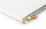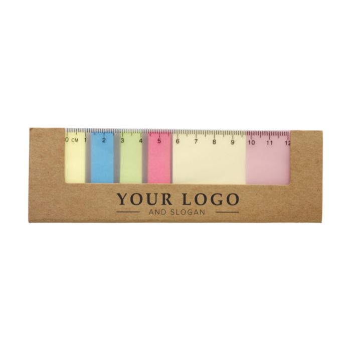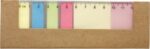 Cardboard cover with a clear ruler (12 cm), two pads of sticky memos, 25 sheets each and multiple colours of smaller sticky notes.