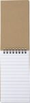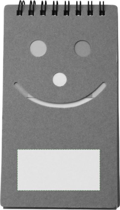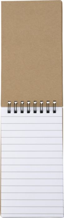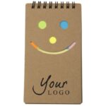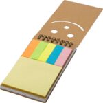 Cardboard, wire bound booklet with a total of 150 sticky notes and a notepad with 50 lined pages.