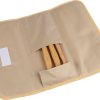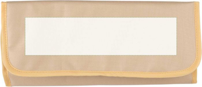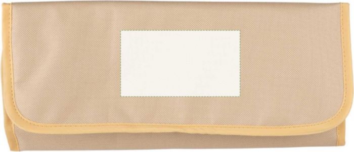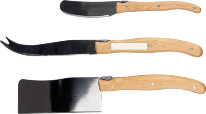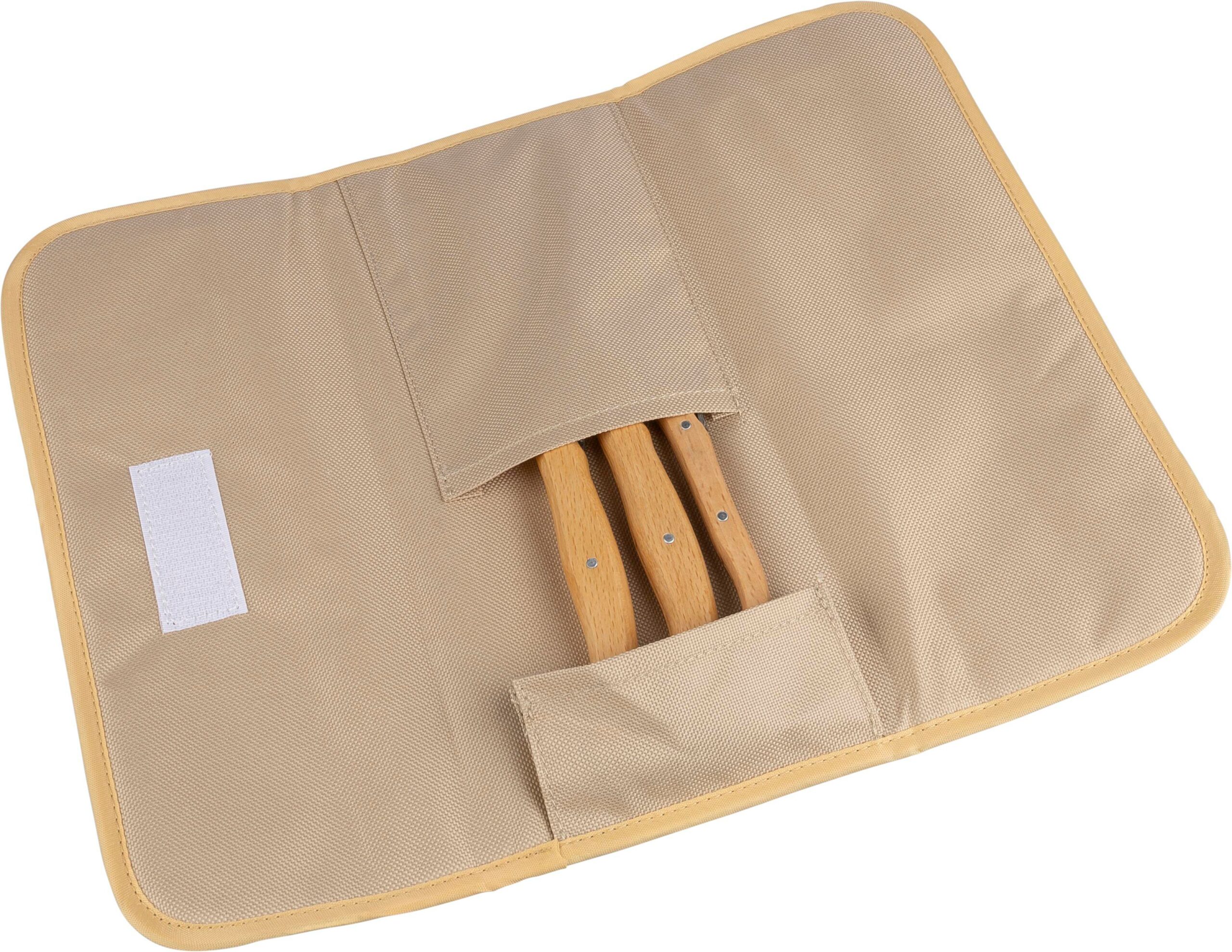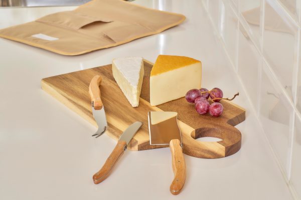 rPET charcuterie set in a 600D Velcro-closed pouch, including three stainless steel knives with wooden handles. Features an rPET label inside. Food-safe. Individually packaged in a brown cardboard box.