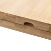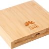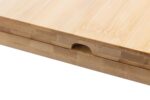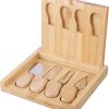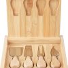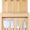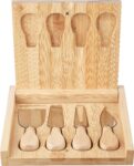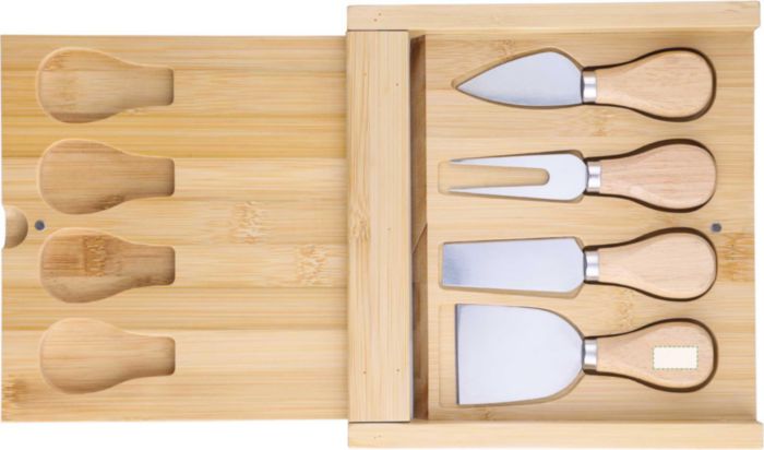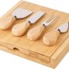 Bamboo cheese board with fold-out design, including four stainless steel cutlery pieces with beechwood handles. Convenient storage compartment keeps the cutlery neatly tucked inside. Individually packaged in a brown cardboard box.