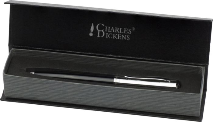 Charles Dickens® ballpen with twist action mechanism and Charles Dickens® logo on the top. Packaged in a deluxe pen case. Black ink.