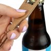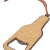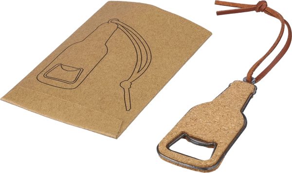 Cork bottle opener with stainless steel and two-sided cork detailing. Includes a PU cord. Individually packaged in a brown paper sleeve.