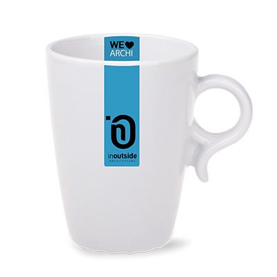 A small and slender advertising mug with a characteristic round handle