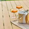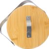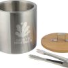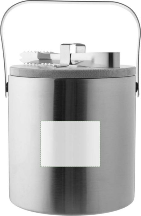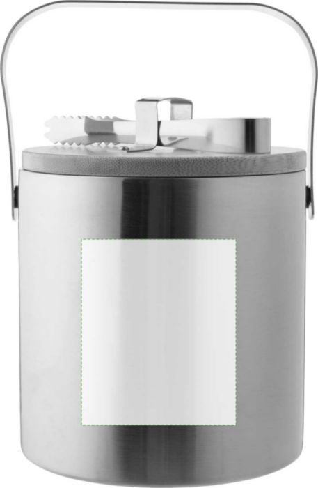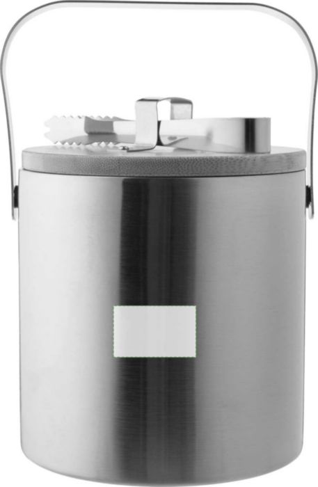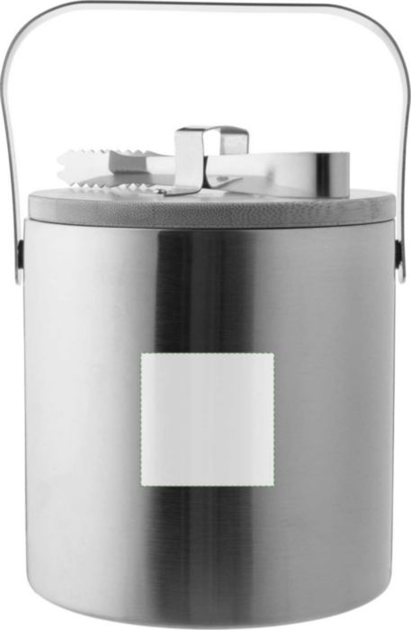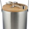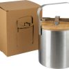 Double-walled stainless steel ice bucket with a bamboo lid and a stainless steel carrying handle. The interior is made of stainless steel 304, and the exterior is stainless steel 201. Includes ice tongs and has a 1200 ml capacity. Individually packaged in a brown cardboard box.