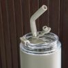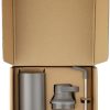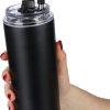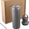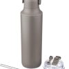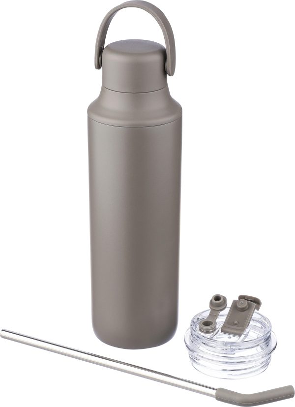 Stainless steel double-walled drinking bottle (500 ml) with interior made of stainless steel 304 and exterior of stainless steel 201. Supplied with two lids: a PP lid with carrying handle and a transparent PS lid for use with the included stainless steel straw with silicone tip and holder. Individually packaged in a brown cardboard box.
