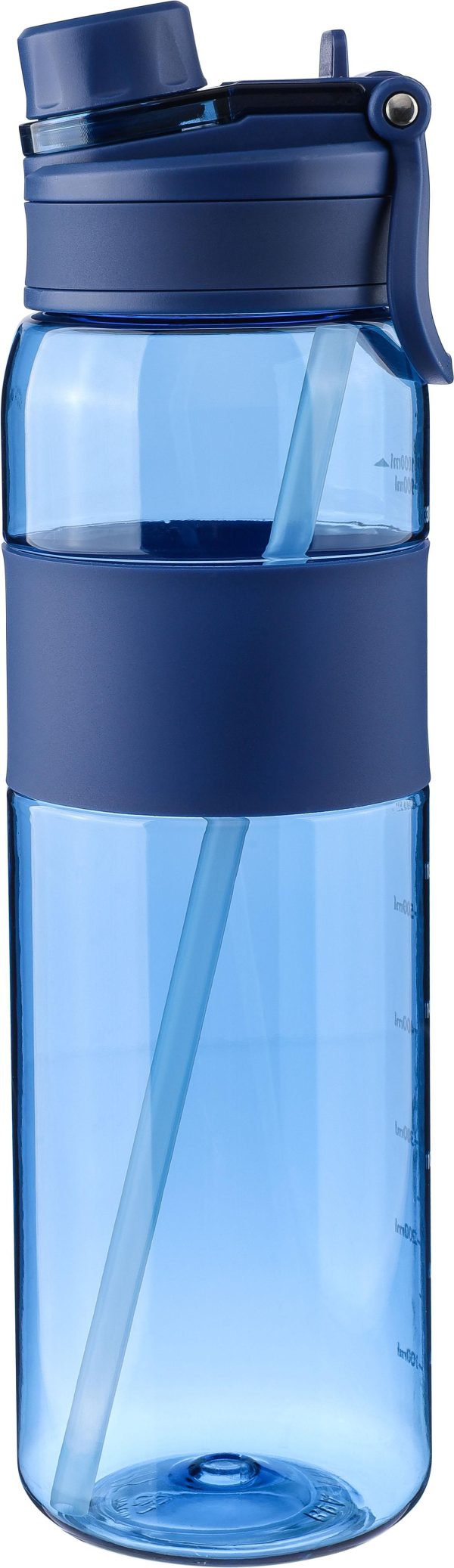 Tritan drinking bottle (900 ml) with two drinking options: a twist-close opening and a foldable straw with internal tube. Features a silicone grip, PP carrying handle, and printed capacity indicator. Screw lid. Packed in eggcrate.