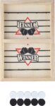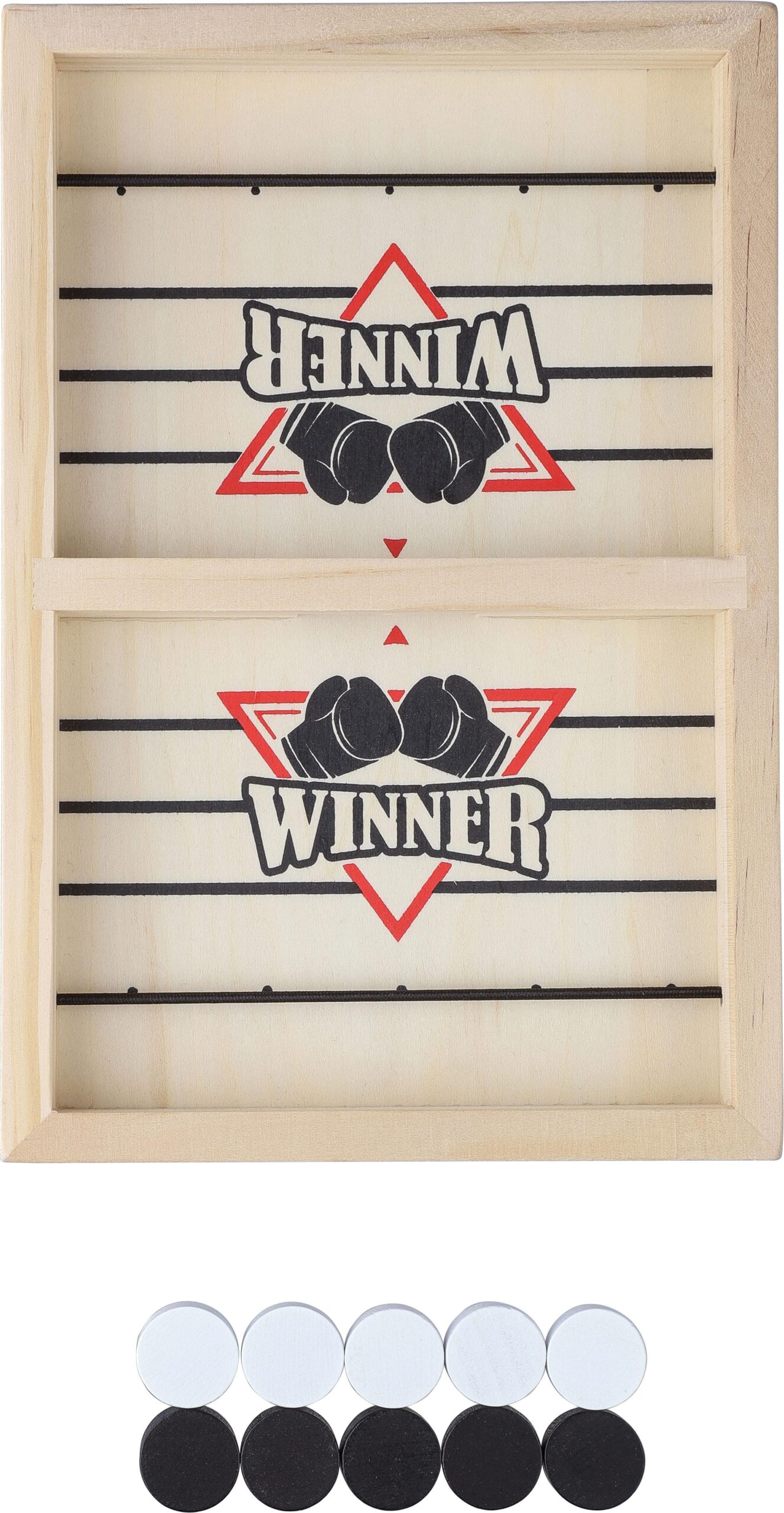 Wooden eviction game. Includes 10 chess pieces (5 white and 5 black) and instructions for easy assembly and play. A fast-paced skill game for adults with a total of 11 pieces. Individually packaged in a brown cardboard box with an illustrated front.