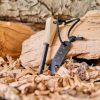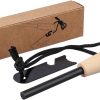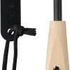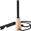 Stainless steel firestarter with pine wood handle and polyester cord connecting the scraper tool and lighting stick. The multifunctional scraper includes a bottle opener, precision ruler, and hex key. To activate, scratch off the black coating on the lighting stick before use. Two-part set. Individually packaged in a brown cardboard box.