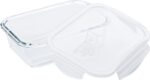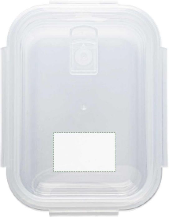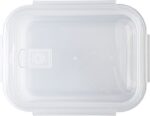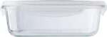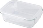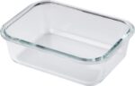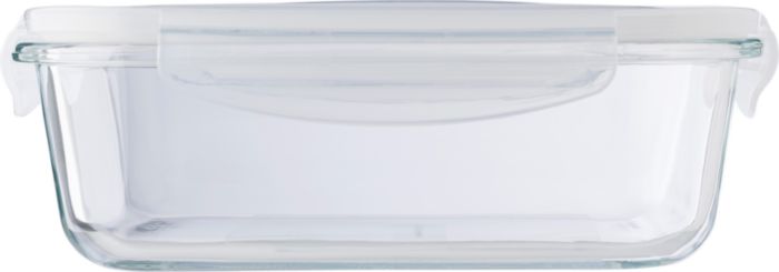 High borosilicate glass lunch box with plastic lid. Suitable for microwave. Capacity: approximately 1 liter.