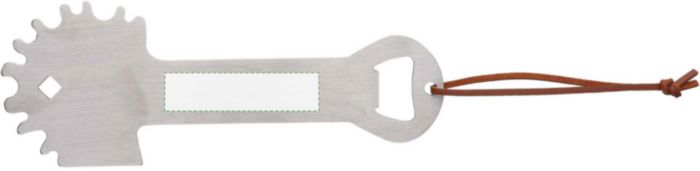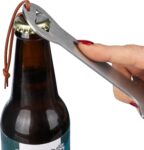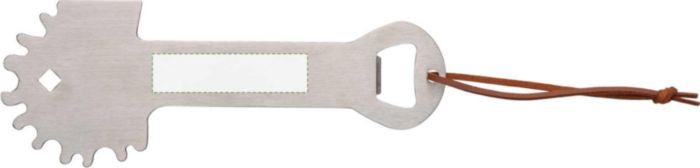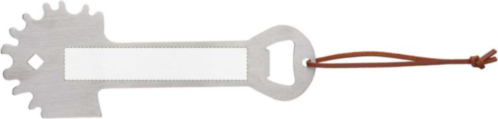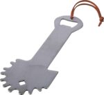 Stainless steel barbecue cleaner with integrated bottle opener function. Includes a PU hanging cord for easy storage. Individually packaged in a kraft paper sleeve.
