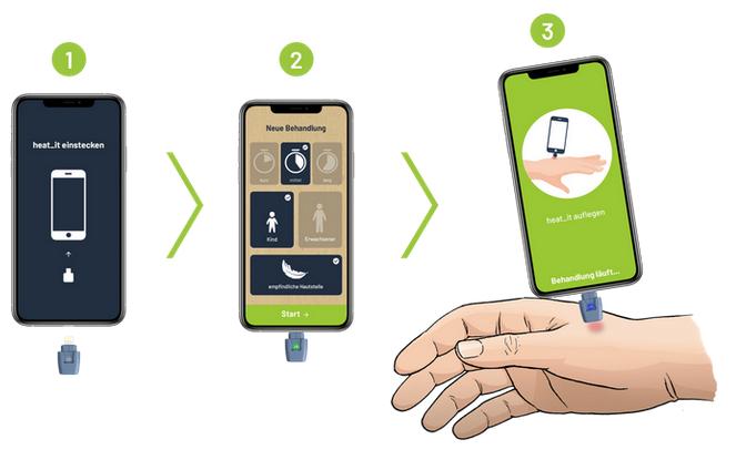 Connect the device to the charging port and open the app. After a short warm-up, place the contact surface on the bite. Depending on the setting in the app, the treatment lasts for 4.7 or 10 seconds.