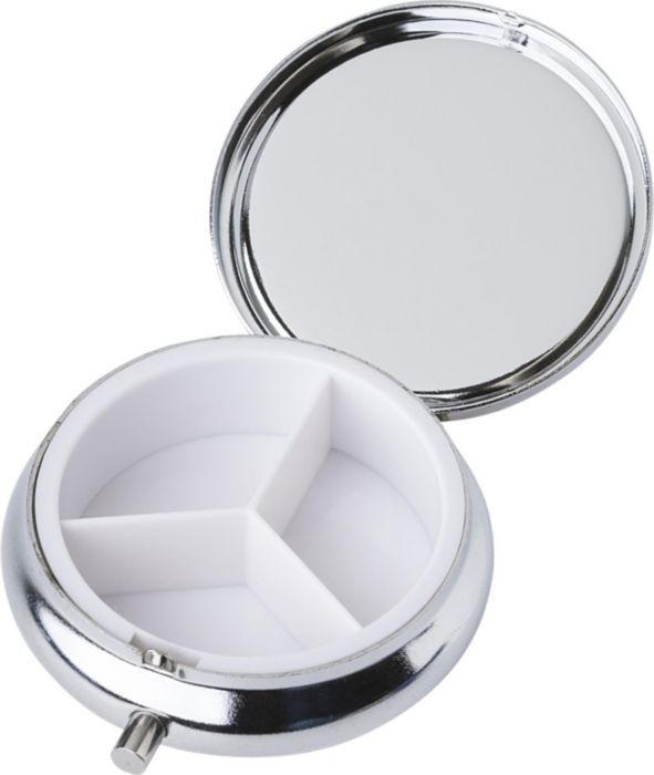 Iron pill box and PP inside with 3 compartments. Shiny inside can be used as mirror. Individually packaged in a white box.