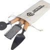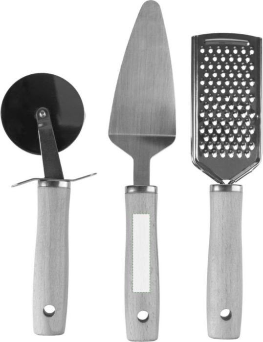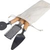 Metal and wooden kitchen tool set, including a stainless steel grater, pie spoon, and pizza cutter, each with a wooden handle. Packed in a cotton drawstring pouch with a pull-cord closure.
