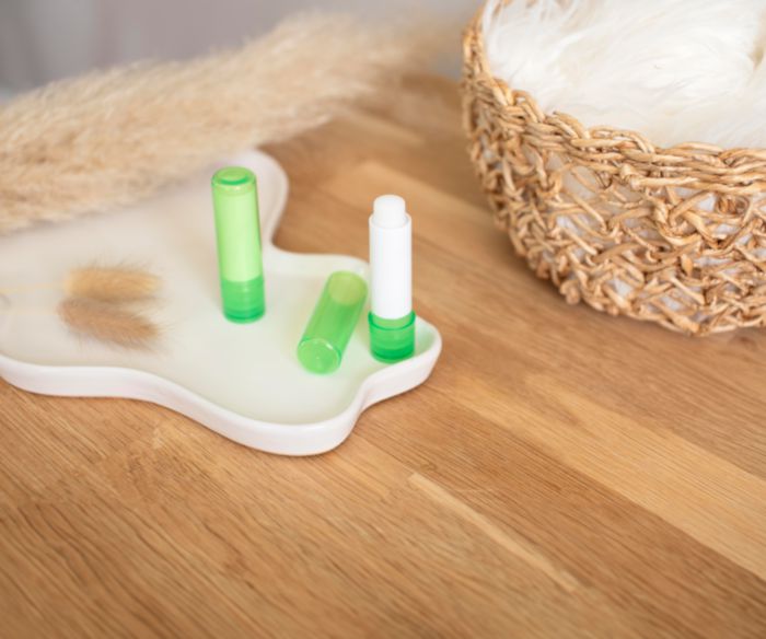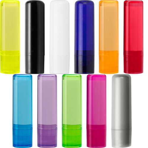 Lip balm with SPF15 protection, in transparent container. The colours white, silver and black have a matt finish.