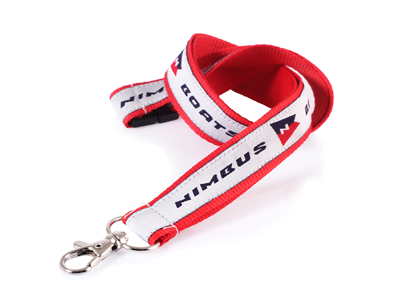 Flat polyester band in optional colour with sewn on woven label. Carbine hook. Including four colour design on the woven label.