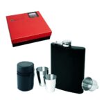 Includes: black flask made of stainless steel, 4 cups in black pouch, funnel.