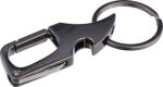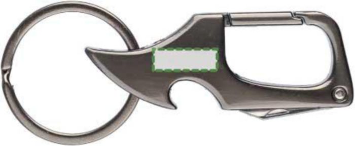 Metal carabiner keychain with a bottle opener and a small knife. The metal of the keychain is electrolyzed. Individually packaged in a brown paper bag.